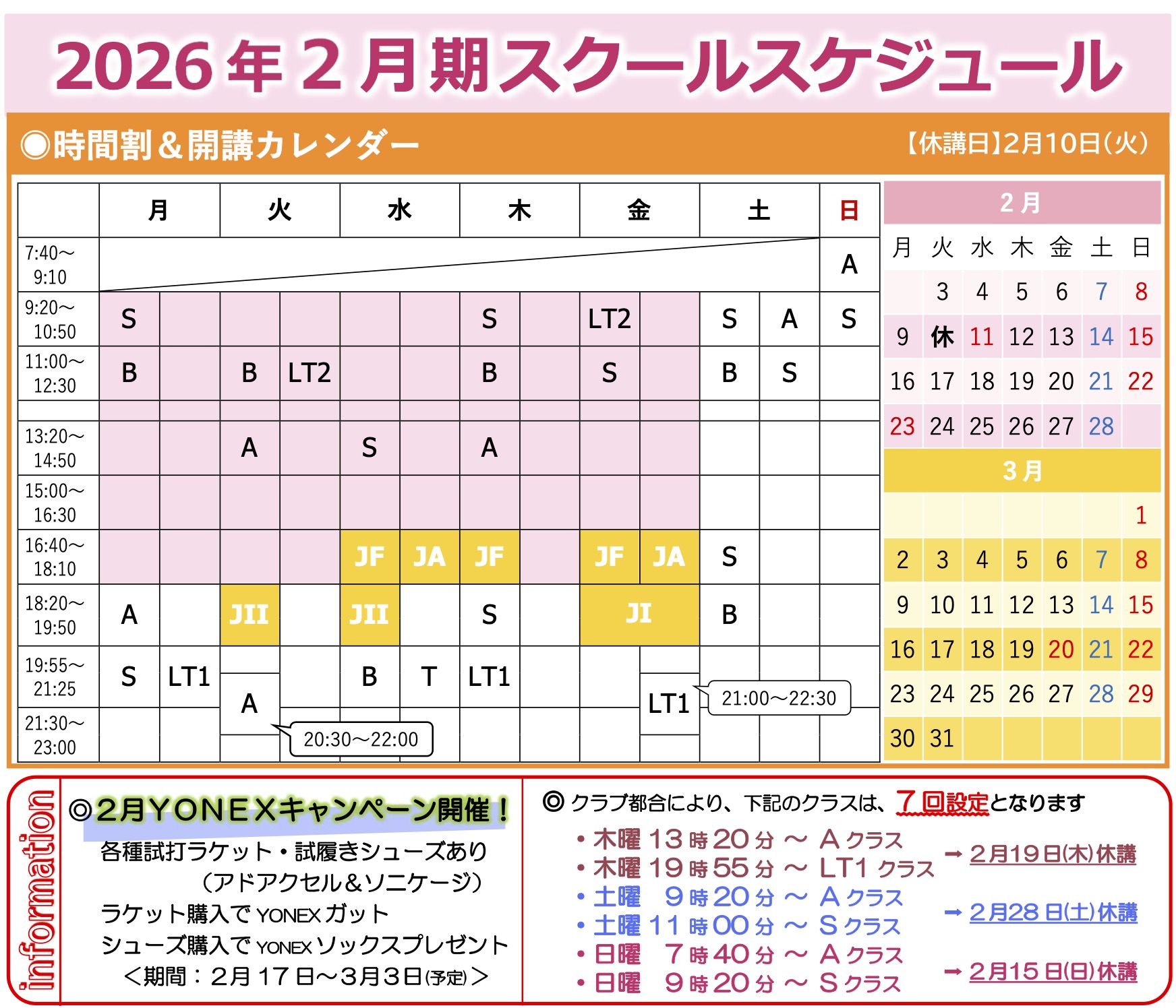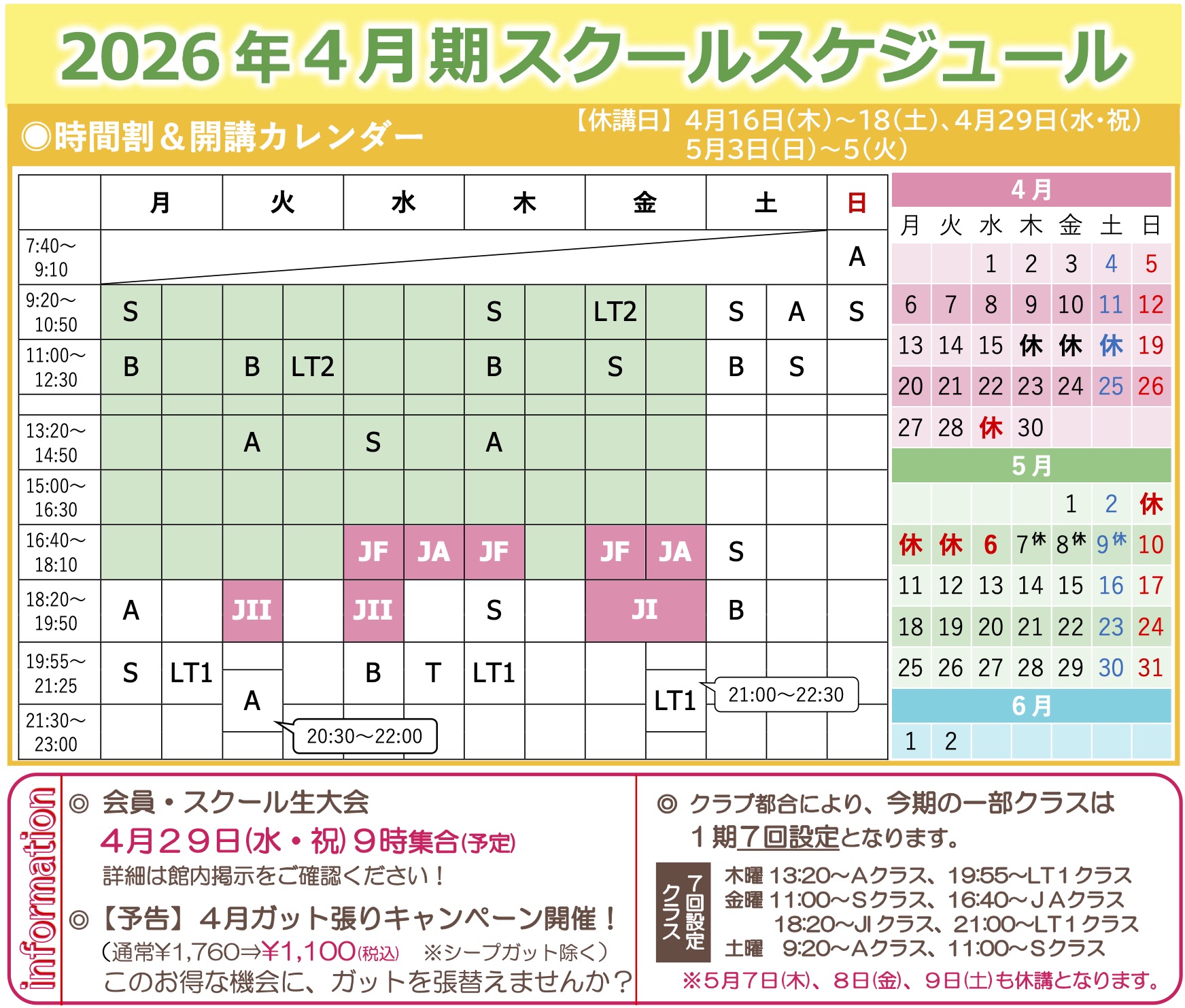 あらゆる世代・レベルの方に楽しんでいただけるよう、平日はもちろん週末や夜間のクラスも充実。